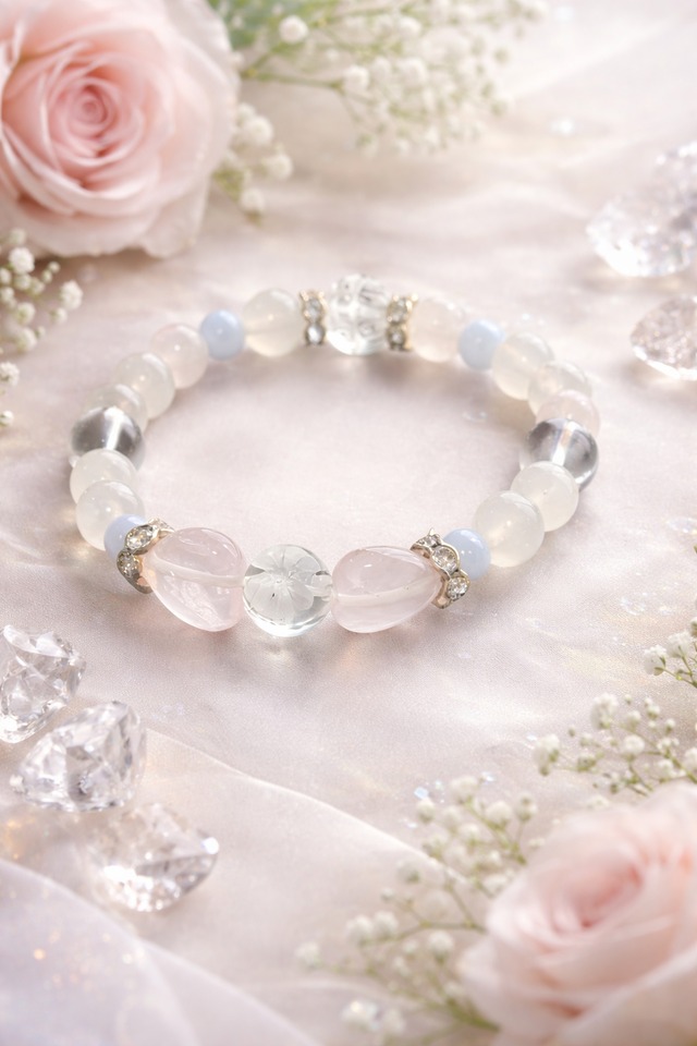 260121 ハートと四葉のクローバー(ローズクォーツ・ブルーレース)内径約16cm ローズクォーツハート×2 ローズクォーツ8mm×12 水晶10mm×2 蓮の花彫刻水晶×1 ブルーレース6mm×2 透明度の高い美しいローズクォーツのハート型があったので幸せを呼ぶ「四つ葉のクローバー」彫刻入り水晶を挟んでみました、ミルキーなローズクォーツとヒーリング効果の高いブルーレース,泥の中でも美しく咲く「蓮の花」彫刻水晶と一緒に優しい感じブレスレットになりました(*^_^*) この美しいハートと四葉のクローバーを組み合わせたブレスレットは、ローズクォーツとブルーレースの優しい色合いが特徴です。ハートは愛と幸福を表し、四葉のクローバーは幸運の象徴として知られています。身につけることで、心を豊かにし、ポジティブなエネルギーを引き寄せる魅力的なアイテムです!(*^_^*) ローズクォーツは、愛と友情を育む石とされ、心の平和をもたらしてくれるでしょう。ブルーレースは穏やかなエネルギーを持ち、コミュニケーションを円滑にする手助けをしてくれるといわれています。このブレスレットは、日常のコーディネートに彩りを加え、自分らしさを表現するのに最適です。 デザインはシンプルでありながら存在感があり、どんなスタイルにも調和します。特別な日のプレゼントや、日常使いのアクセサリーとしてぴったりです。ローズクォーツとブルーレースの優しい組み合わせを楽しみながら、愛と幸運を感じてください。 定形外郵便での発送は通常2日~5日お時間を要しますので、あらかじめご了承ください。商品は実物に忠実なイメージをお伝えできるよう努めておりますが、写真の色合いやイメージに違いが生じることがありますので、その点についてご理解のほどお願い申し上げます。当店の商品は全て返品可能ですので、安心してお買い求めいただけます。返品の際の送料はお客様にご負担いただきますが、破損や不良があった場合は当店が負担いたしますので、どうぞご安心ください。