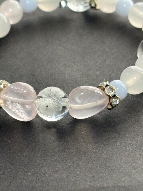 ローズクォーツは、愛と友情を育む石とされ、心の平和をもたらしてくれるでしょう。ブルーレースは穏やかなエネルギーを持ち、コミュニケーションを円滑にする手助けをしてくれるといわれています。このブレスレットは、日常のコーディネートに彩りを加え、自分らしさを表現するのに最適です。