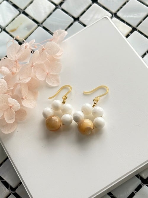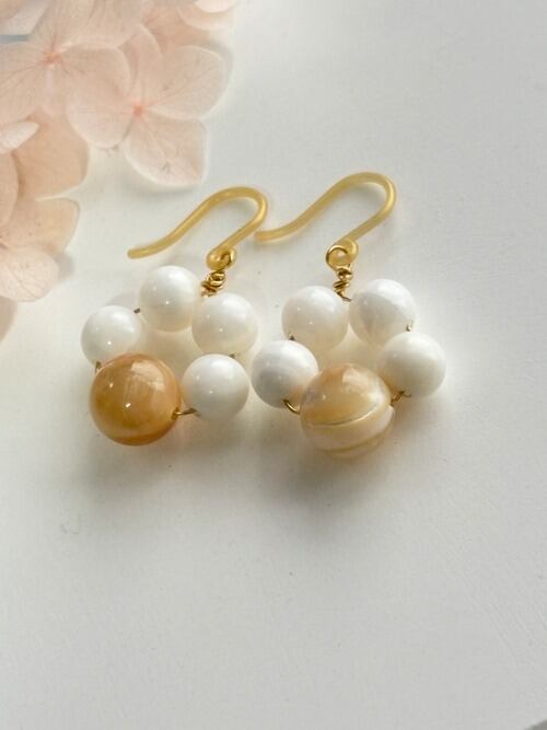 優しい印象のマザーオブパールとパールのような白蝶貝が女性らしい可愛いピアスです。