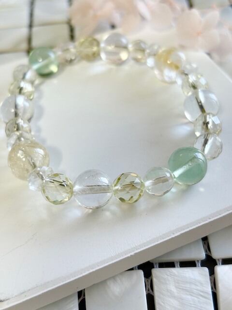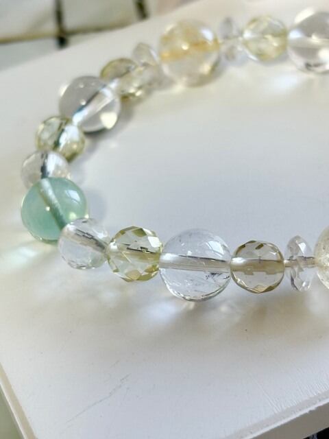金運アップ,豊穣,幸運を呼ぶ石と呼ばれるシトリンを中心に,浄化,癒し,暗闇で光を灯してくれるフローライト,同じく癒し効果が高く幸福,明朗,壮健の石であるレモンクォーツを取り入れた爽やかなブレスレットです。クリエイターの方にも最適なブレスレットです。