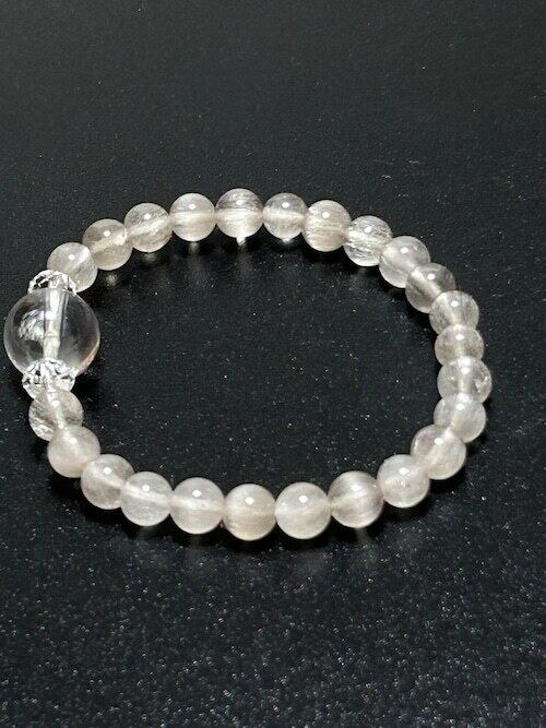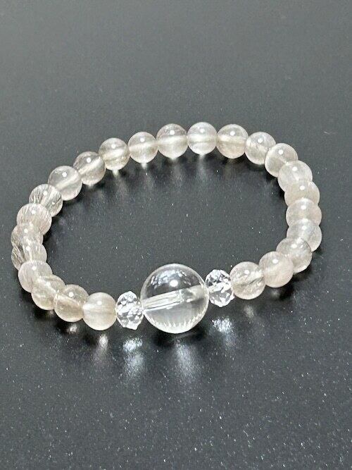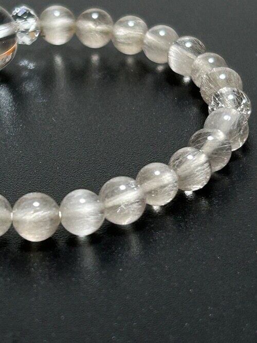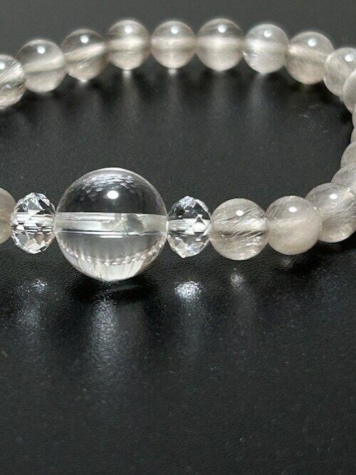 美しいシルバールチルクォーツにおおきめの水晶一個をアクセントに入れました。とってもクールでかっこいいルチルクォーツブレスレットです。