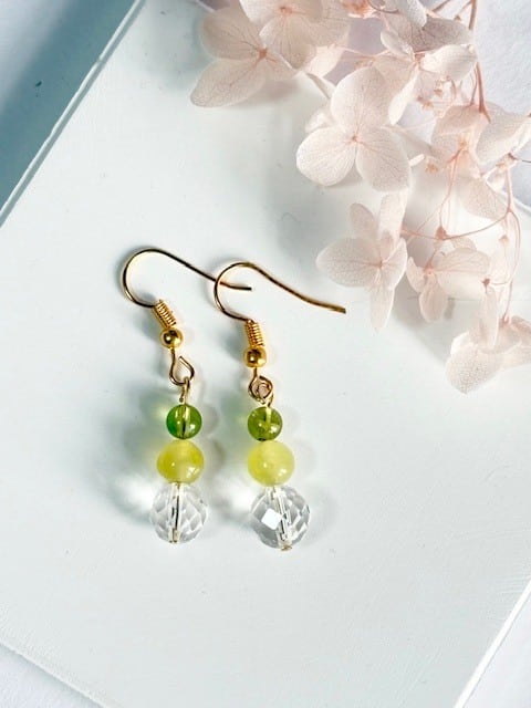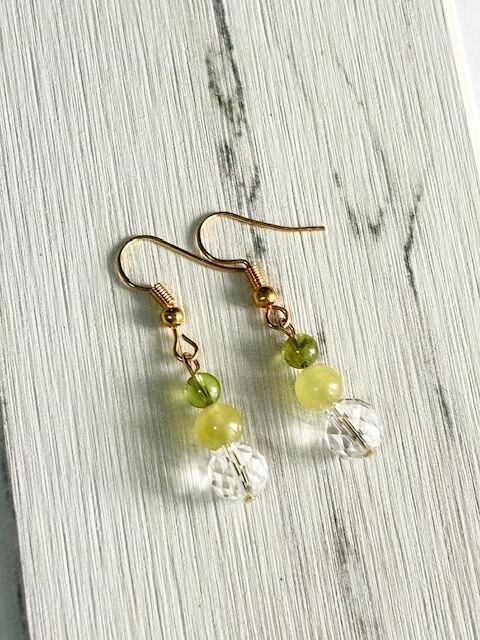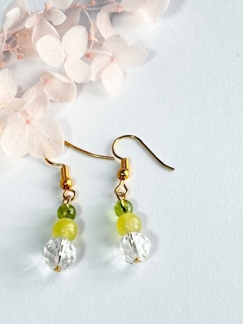 ヒーリング効果・癒し効果が高いプレナイトがネガティブな心を浄化し、太陽の石ペリドットが明るい太陽に向けてポジティブなエネルギーに変換してくれます。またキラキラカット水晶が良い気を拡散。キラキラ光る可愛いピアスです。