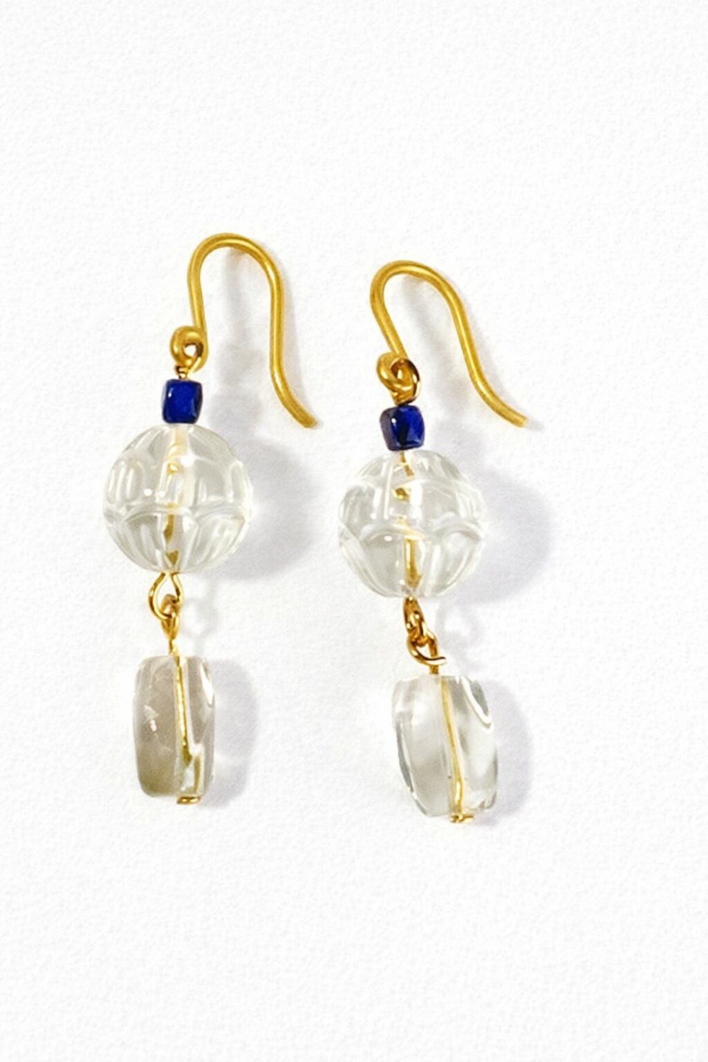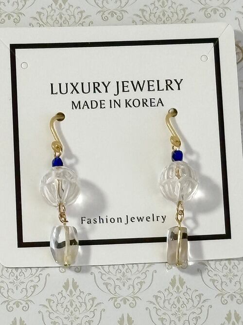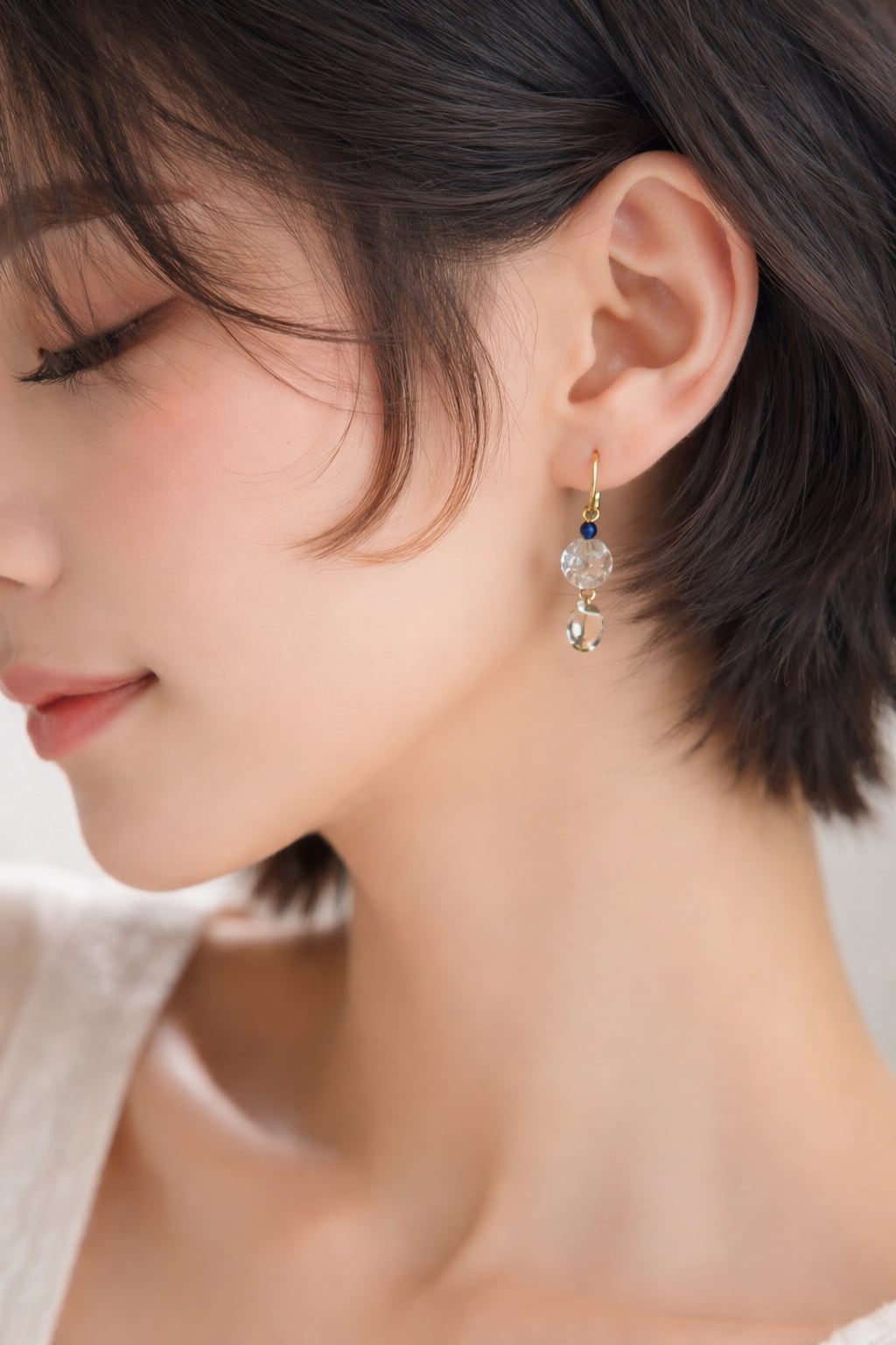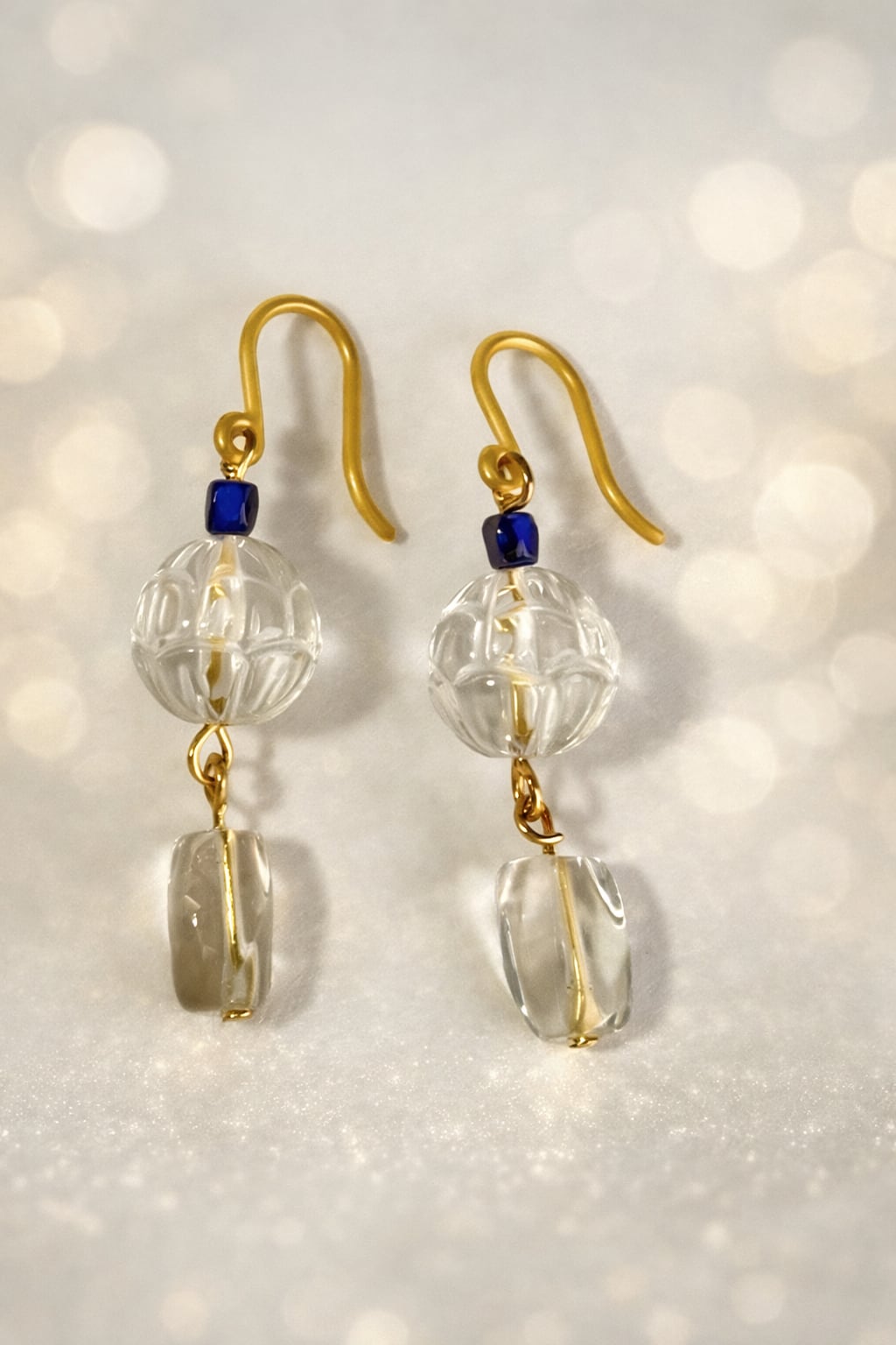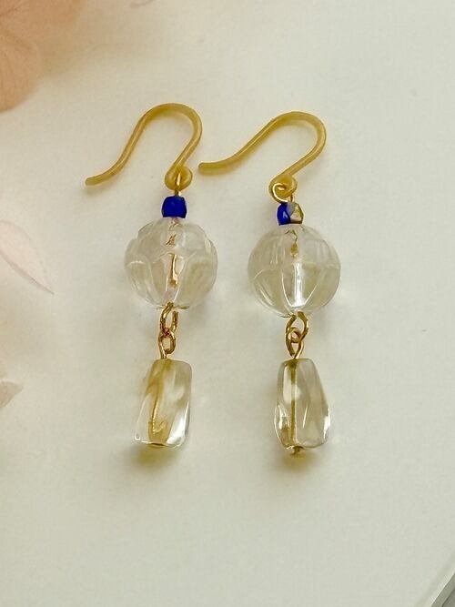 心穏やかになる蓮の花を形どった水晶と怒りや不安を鎮めてくれるスワロフスキービーズのブルーが目を引き、縦長のスモーキークォーツがグラウディングを助ける揺れるタイプのピアスです。
